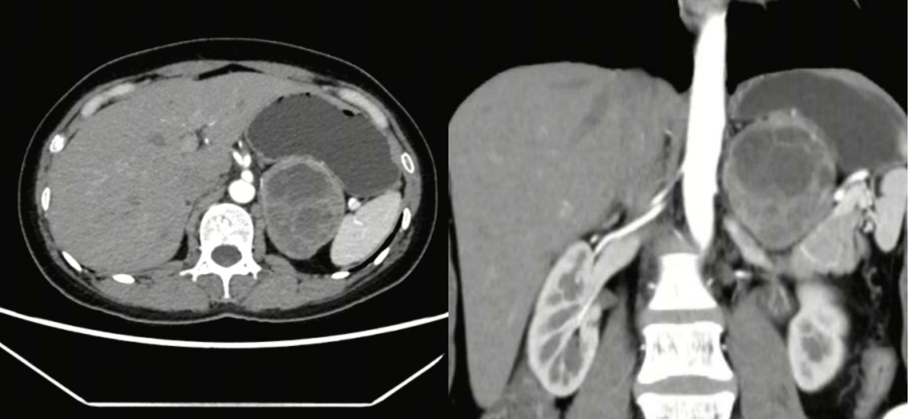 患者余女士,因“体位改变后反复出现心悸、心慌不适3年”于门诊就诊,入院后完善相关检查,考虑为嗜铬细胞瘤,检查发现左侧肾上腺肿瘤大小约68mm×56mm×63mm,手术指征明确。嗜铬细胞瘤术中存在血压剧烈波动可能,为降低术中血压波动,术前给予应用 α 受体阻滞剂2周及扩容治疗,减少最高收缩压或高血压诱发的心脑血管意外的影响。我院泌尿外科肖运政主任克服重重困难,联合“三名工程”团队与我院影像科、麻醉科、内分泌科、心血管内科专家启动多学科诊疗(MDT),制定了“拆弹”方案——腹腔镜左侧嗜铬细胞瘤切除术。