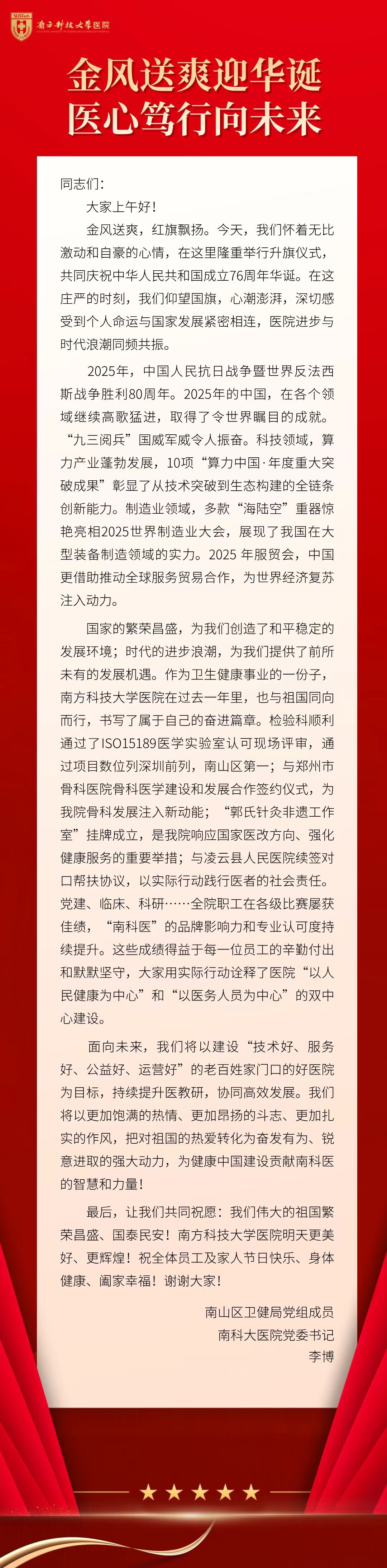 升旗仪式后,李博书记在讲话中指出,我国在算力产业、“海陆空”重器制造、服贸会等各领域均取得令世界瞩目的成就,国家的繁荣昌盛为卫生健康事业发展创造了和平稳定环境、提供了前所未有的机遇。回望过去一年,我院与祖国同向而行:检验科通过ISO15189评审且项目数居深圳前列、南山区第一;与郑州市骨科医院合作赋能骨科发展;“郭氏针灸非遗工作室”挂牌;续签凌云县人民医院帮扶协议。全院在党建、临床、科研等各方面屡获佳绩,“南科医”品牌影响力持续提升。