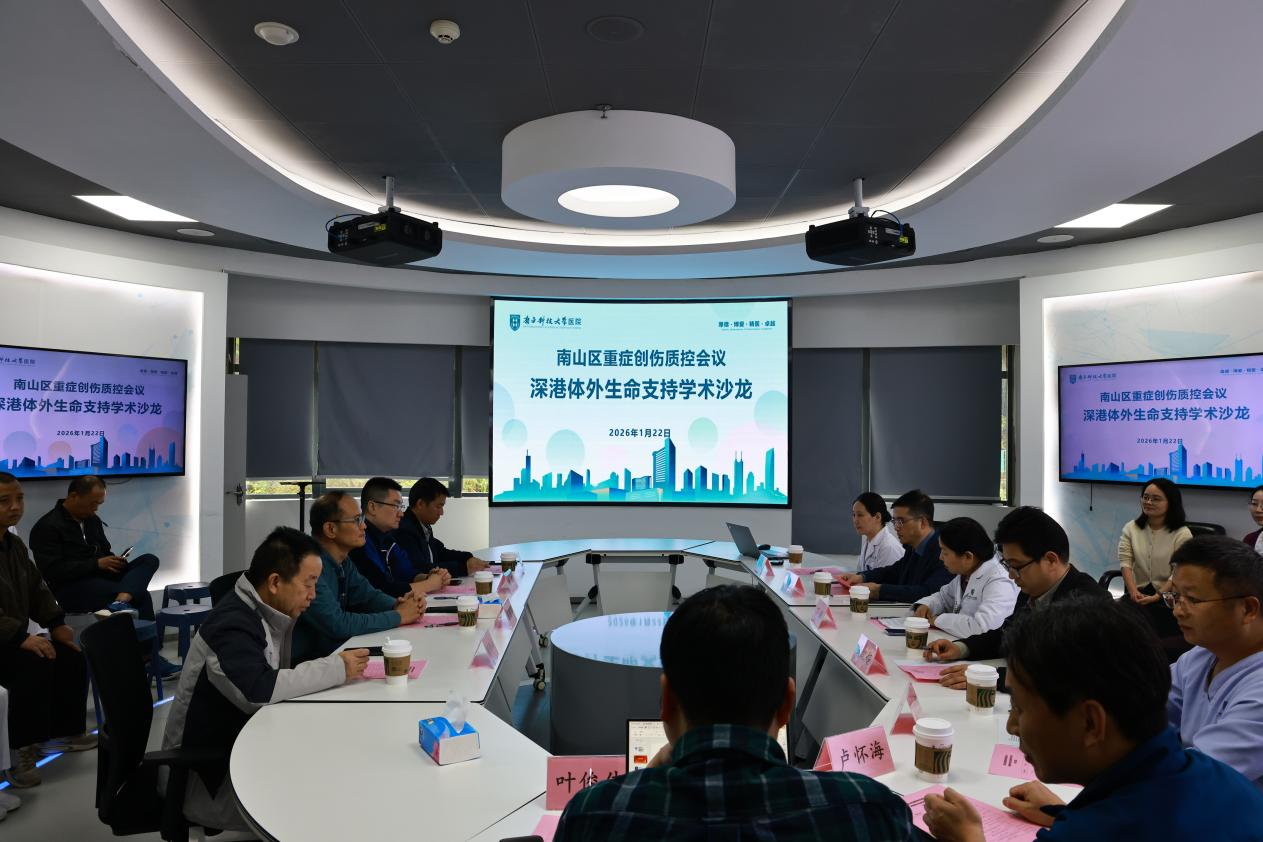 【通讯员:卢怀海 叶俊伟】为深入贯彻“健康中国2030”战略部署,加速推进重症医学学科同质化发展,2026年1月22日,由。我院重症医学科主办的“南山区重症创伤质量控制会议暨深港体外生命支持学术沙龙”在我院住院部5楼科创中心会议室隆重举行。本次会议以“融合创新、生命至上”为主题,聚焦体外膜肺氧合(ECMO)技术在急危重症救治中的前沿应用,旨在构建深港重症医学高水平交流平台,全面提升粤港澳大湾区急危重症协同救治能力,为南山辖区及周边地区患者提供更优质、更高效的医疗保障。