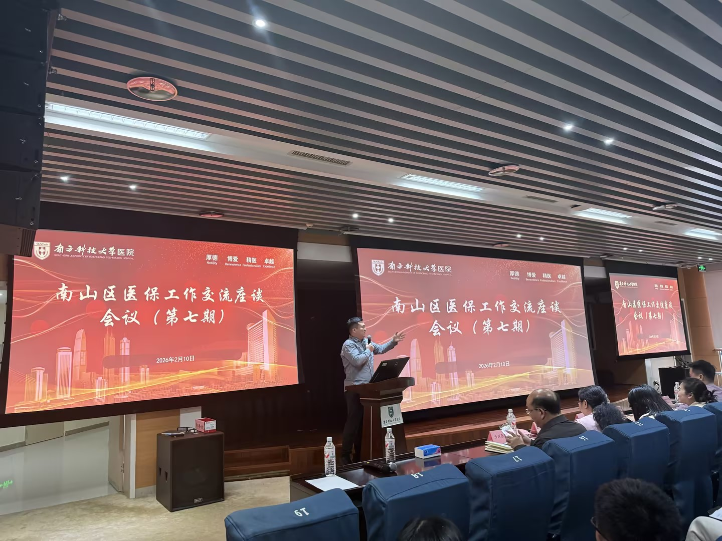 【通讯员:王勇】新春将至,医保工作谋划正当时。2026年2月10日,南山区第七期医保工作交流座谈会在我院住院部501会议室成功举办。本次会议以规范医疗保障服务行为、强化医保基金监管协同联动、破解工作难点堵点为核心,为新一年辖区医保工作高质量发展谋篇布局。深圳市医疗保障局南山分局、南山区卫生健康局相关领导,辖区各定点医疗机构医保物价管理负责人及业务骨干齐聚我院,我院宋巧荣总会计师、财务与运营管理部柯冬阁部长出席会议,财务与运营管理部刘剑臻副部长受邀分享医保物价管理工作经验,相关实践举措获上级部门高度评价及各参会单位一致认可。