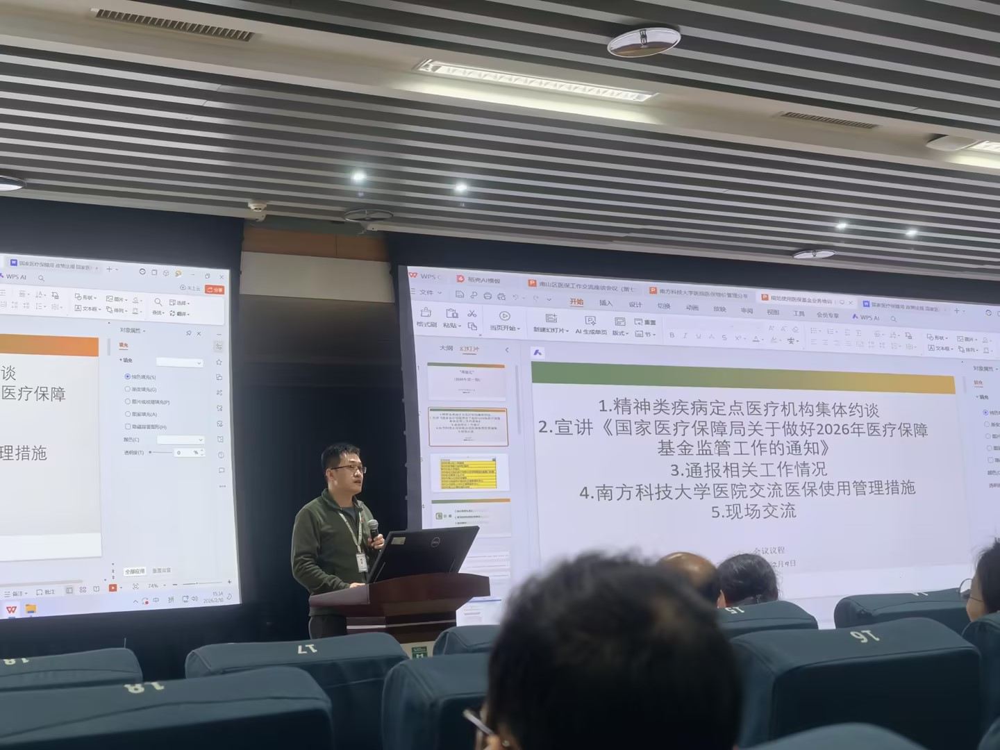 本次座谈会议程紧凑、内容务实,紧扣 2026 年医保基金监管工作核心要求有序推进。会议伊始,南山分局医监科对精神类疾病定点医疗机构开展集体约谈,重申医保基金规范使用的底线要求,明确医疗服务行为标准。随后,分局医监科负责人对《国家医疗保障局关于做好 2026 年医疗保障基金监管工作的通知》进行全面系统解读,围绕最新工作要求、重点监管事项、年度推进方向展开详细宣讲,为辖区各定点医疗机构新一年医保工作开展划定重点、明晰标准,助力参会人员精准把握政策导向与实操要点。