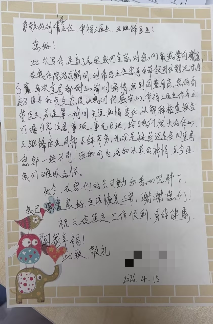 康复后,患者王先生亲笔写下感谢信,深情表达了对手足显微外科团队的诚挚谢意,特别称赞团队医术精湛、护理贴心,感谢他们成功挽救了自己的手指,并帮助自己顺利康复。