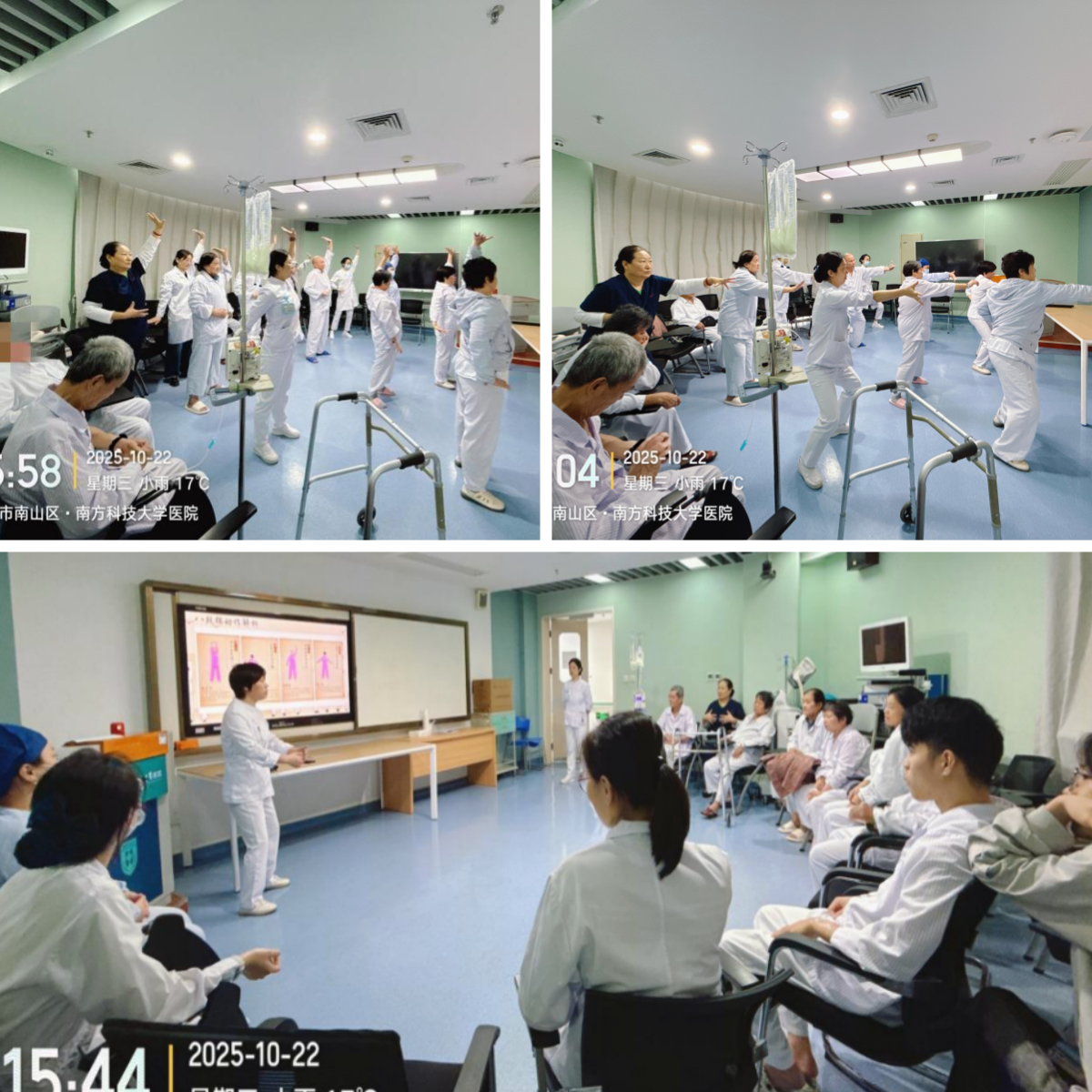 【通讯员:李燕兰】为深化优质护理服务内涵,创新健康教育形式,促进患者早期康复,10月22日下午四时,在十二病区护理团队的精心组织与策划下,特邀中医科护理同仁肖红花、周媛媛,在病区示教室成功举办了一场别开生面的“中医养生操八段锦”主题工休座谈会。此次活动是中西医护理模式一次富有成效的跨界合作,现场气氛热烈,收获患者及家属的一致好评。