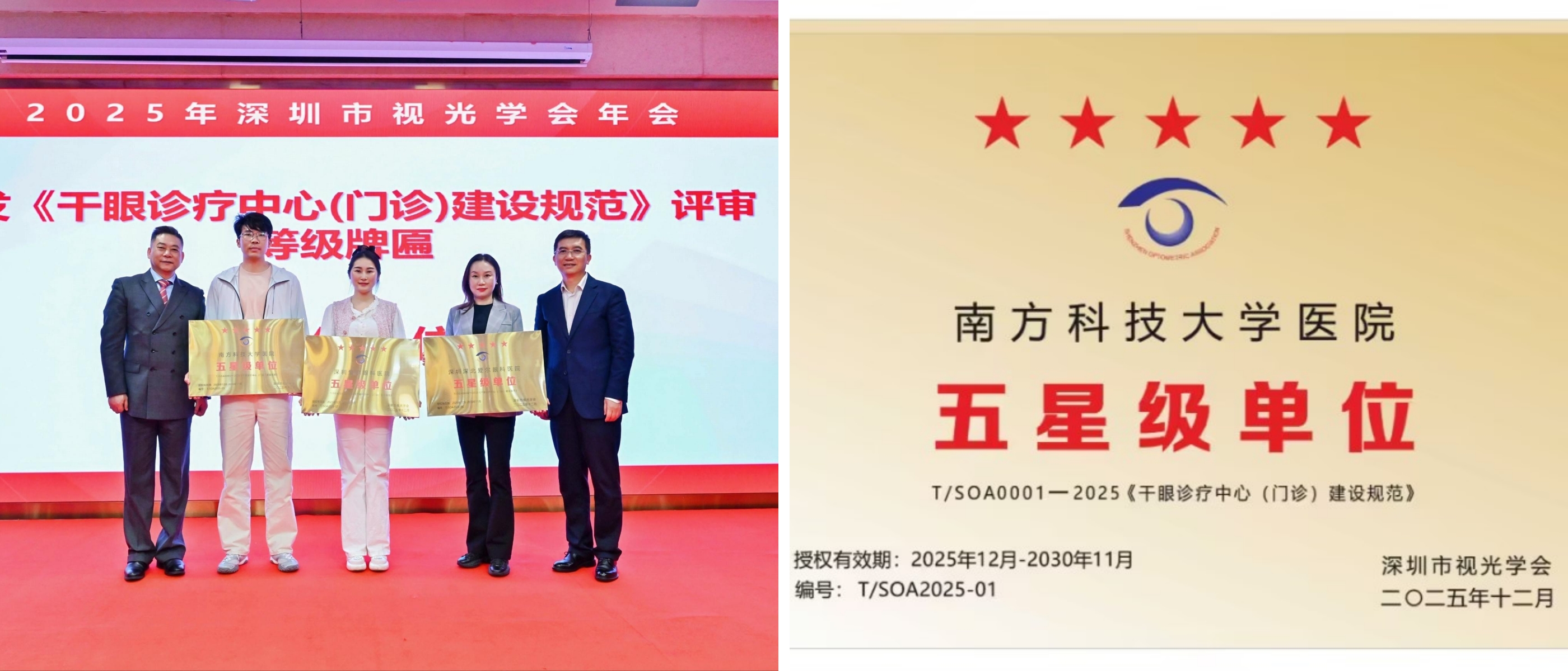 【通讯员:方爱玲】12月12日,在深圳市视光学会第三次年会上,我院眼科被正式授予“深圳市干眼诊疗中心”五星级单位牌匾。目前全市仅三家单位获此认证,我院为其中唯一公立综合医院。这标志着我院在干眼规范化、系统化诊疗体系建设上取得了重要突破,专业能力与服务品质获权威认可。