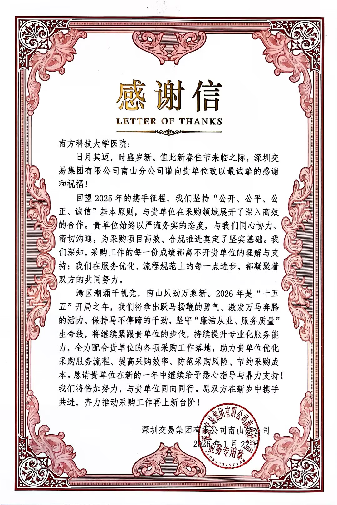 感谢信中,深圳交易集团有限公司南山分公司对我院招标采购工作给予积极评价,充分肯定了我院在协作高效、沟通顺畅、坚守合规等方面的工作表现,对我院高效协同完成各项招标采购任务、全力保障项目顺利推进的务实作风表示诚挚感谢。回顾上一年度,我院严格依法依规开展招标采购工作,持续完善内部管理制度、规范全流程工作环节,各相关科室密切协同,从需求提报、技术论证到审核把关、组织实施,各环节严谨有序、落实到位,确保程序规范、操作透明、责任清晰,有效保障了医疗设备采购、信息化改造等重点项目顺利实施。此次获得认可,也离不开深圳交易集团有限公司南山分公司在业务指导与协作中的大力支持。