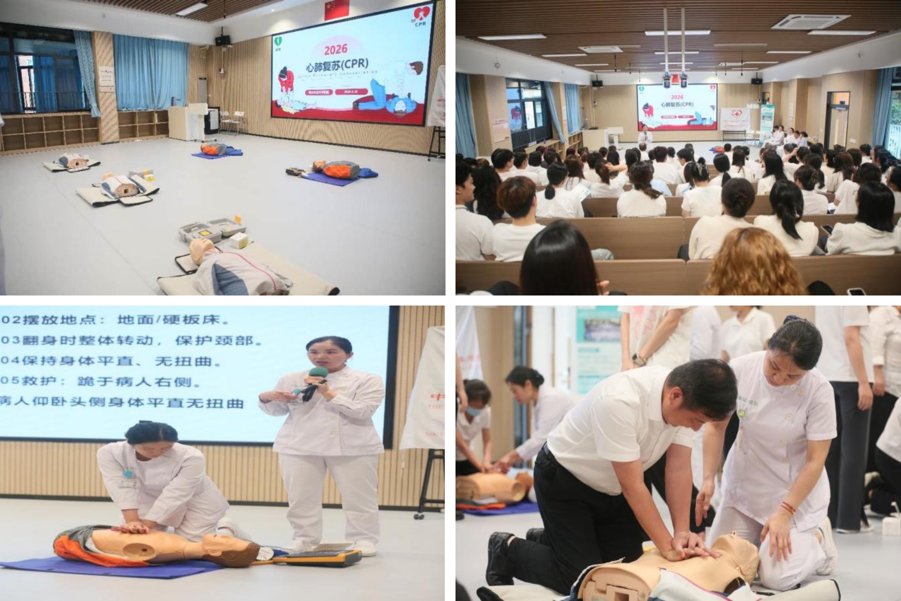 培训现场秩序井然。医疗团队系统讲解心脏骤停危害、“黄金4分钟”原则、心肺复苏及AED操作流程,急诊科护士长邱芬授课深入浅出,帮助教师直观掌握急救要点。