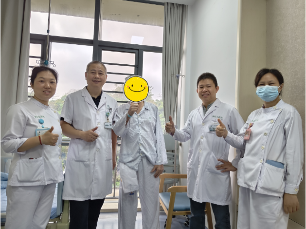 76岁的毛爷爷(化名)今年2月因急性化脓性胆囊炎伴胆囊结石在当地医院就诊,因合并脑出血后遗症、高血压、进展性肺纤维化及重度肺通气功能障碍,被评估为“手术禁区”,仅行胆囊穿刺引流缓解症状。然而,术后右上腹疼痛仍反复发作,严重影响生活。1个月前,患者因交通性脑积水入住我院神经外科,治疗期间胆囊炎再次加重。肝胆胰外科、麻醉科与神经外科多学科讨论认为:患者神经系统疾病稳定,但胆囊炎症持续存在,药物疗效有限,手术指征明确。面对局部粘连严重、肺功能极差等挑战,刘海林主任决定采用吲哚菁绿荧光导航腹腔镜技术,实时显示胆道结构,最大限度避免损伤;麻醉科李菁菁副主任则通过气管插管联合神经阻滞麻醉,减少呼吸抑制风险,并指导患者术前、术后进行肺功能锻炼。手术成功切除病变胆囊,患者术后第1天即可下床活动,目前已康复出院。
