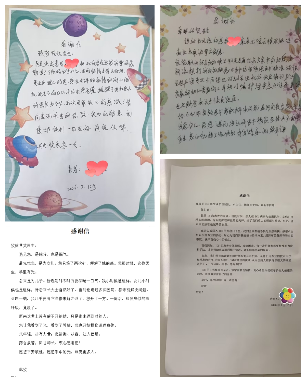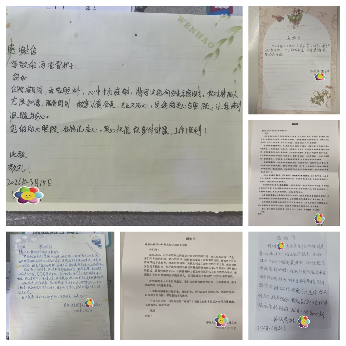 本月,重症医学科、急诊科、肿瘤科、呼吸内科、内分泌科、肝胆胰外科、眼科、妇科等多个科室接连收到赞誉。重症救治争分夺秒,急诊急救高效有力,专科诊疗精准细致,日常护理贴心周到。医护人员以敬佑生命为使命,用耐心与责任守护患者健康,赢得广泛认可。